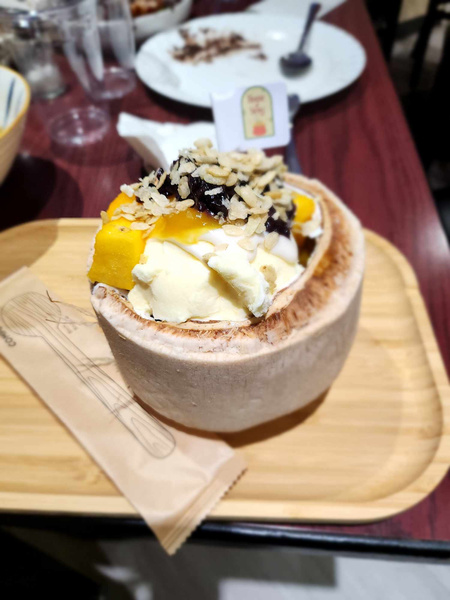 2 Scoops of Vanilla Ice Cream, Shredded coconut, Mango compote, topped with toasted rice flakes & Diced Mango