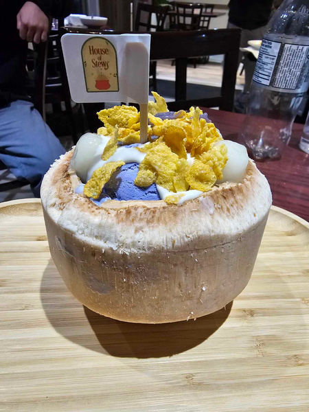 2 Scoops of Ube Ice Cream, shredded coconut, ube pudding, topped with coconut syrup, cornflakes and mochi